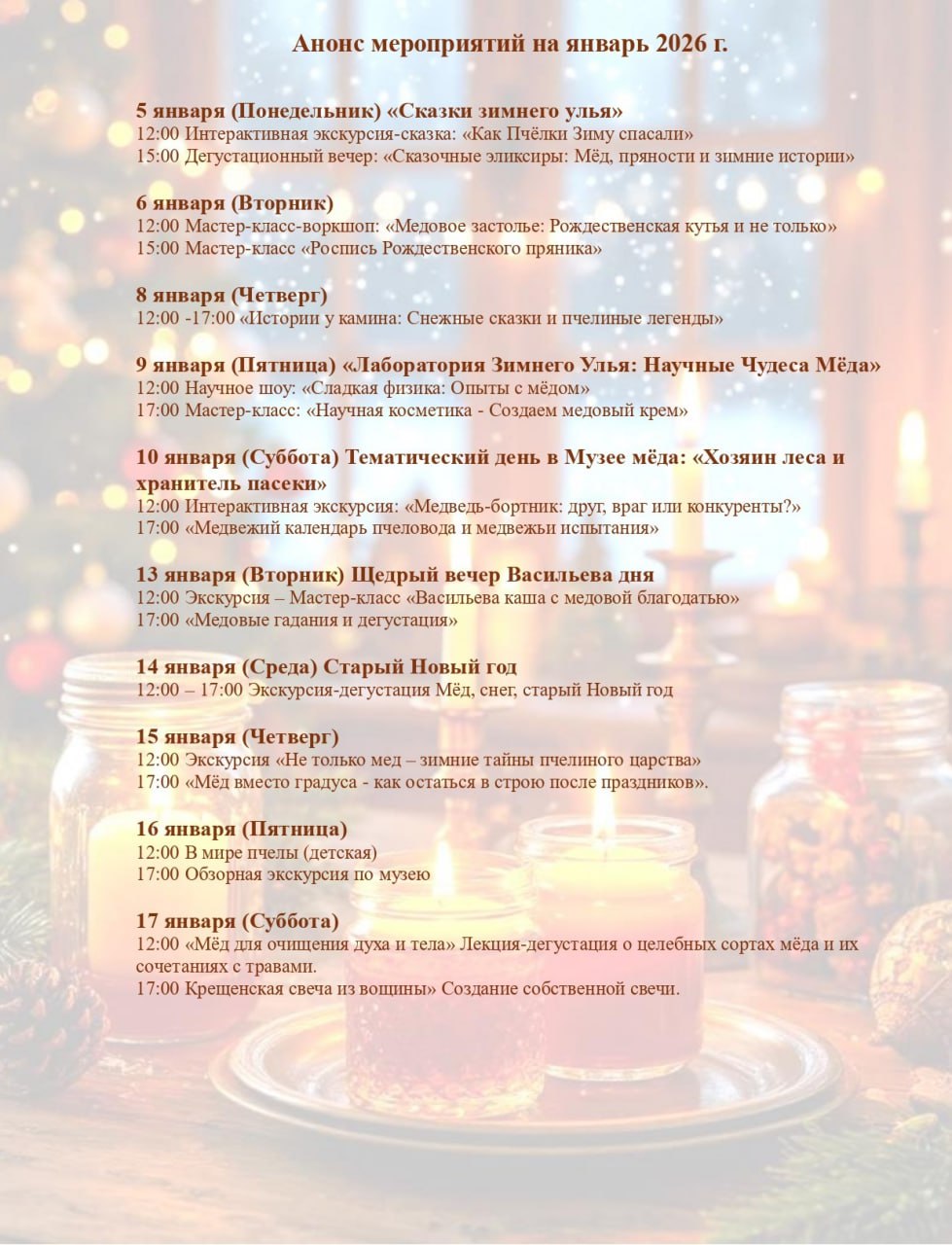 Друзья, мы подготовили для вас насыщенную программу на январь! В нашем музее меда «Пчелотека» вас ждут увлекательные экскурсии, творческие мастер-классы и, конечно, знакомство с удивительным миром пчел.